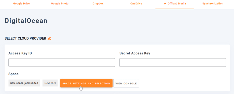 Navigate to menu Settings > WP Media Folder > Cloud > Offload Media > DigitalOcean, click on Space settings and selection button.
