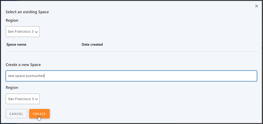 Now select the region, the Space name and click on Create.