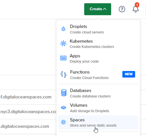 To create a new space in DigitalOcean, click on the green create button and then click on space.