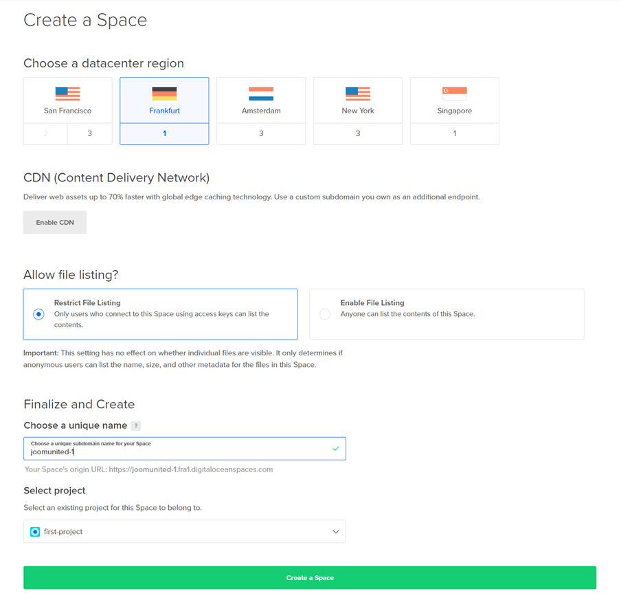 Now you will be able to select the datacenter region, type the name for the space and click on Create.