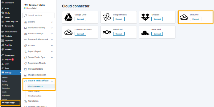 Make sure both the main plugin WP Media Folder and its Cloud Addon are installed and activated in your WordPress environment. The OneDrive integration is part of the cloud extension.