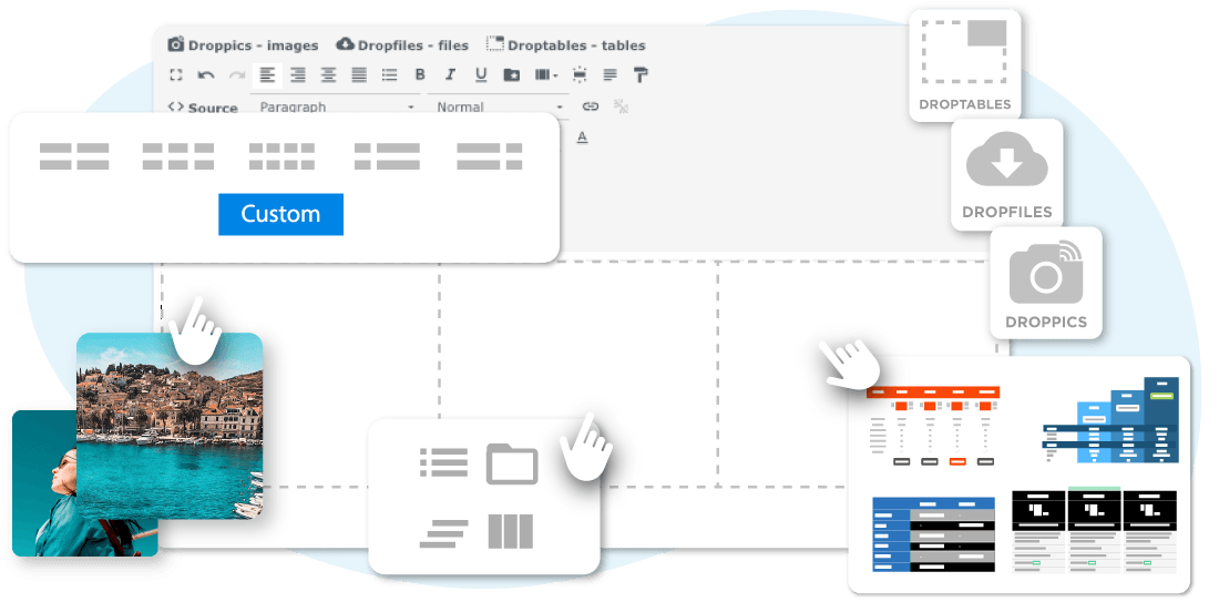 DropEditor integrates Droptables, enabling spreadsheet-style table creation, inline editing, and advanced table tools right from the Joomla editor.
