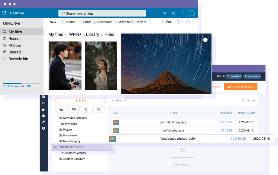 Dropfiles connects your Joomla site to OneDrive, allowing files and folders to be synchronized, managed, and accessed in both platforms with bi-directional updates.
