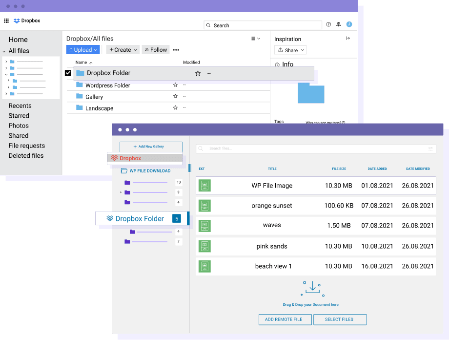 The WP File Cloud addon is a plugin that adds to WP File Download the possibility of connecting and synchronizing our WordPress file manager with the Dropbox cloud services. The Dropbox connection offers duplex synchronization for all your files. What's more, Dropbox integration comes in the same Addon with Google Drive, Microsoft OneDrive Personal, Microsoft OneDrive Business, WooCommerce integrations and a social locker for download! Check more features in the main plugin WP File Download product >>