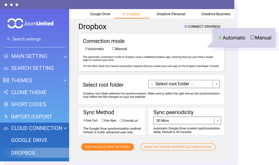 Don't worry, you don't have to be a developer to ensure the connection works :) There's 2 connection methods, the first one is click and connect using your Dropbox username and password. The second method is to create your own Dropbox App to get your credentials. There are several synchronization methods that fit different server requirements, such as AJAX sync, Curl, or custom Cron tasks. You can also setup a synchronization delay or force the synchronization manually. Finally there's also the online documentation and our support team is available to help you with the configuration.