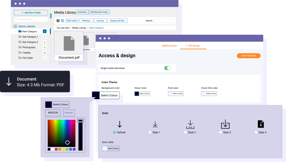WP Media Folder includes a feature to add design to files that are available for download, such as PDF or ZIP files. Define the colors of the download button and your media links have the same style all over your website.